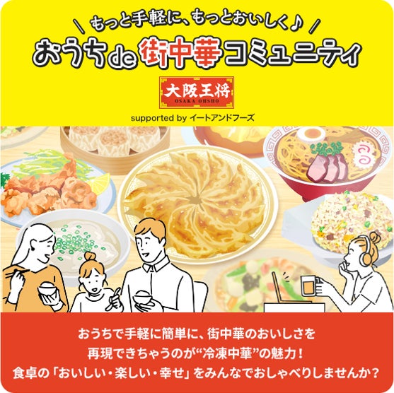 おうちde街中華コミュニティは、大阪王将の冷凍食品を製造、販売しているイートアンドフーズが運営しています。食卓をおいしく…