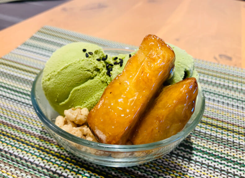 外はカリッと、中はホクホクの大学芋に、ひんやり濃厚な抹茶アイスを添えた和スイーツ。大学芋の蜜のやさしい甘さと、アイスのほんのりとした苦みが絶妙にマッチします。冷たくて甘い、口どけまろやかな組み合わせは、一度食べたらやみつきに。グラノーラやナッツを入れてれば、香ばしさと食感がプラスされます。おうちカフェにぴったりのデザートです♪