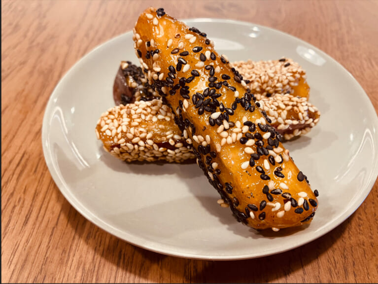 解凍した大学いもに黒ごま&白ごまをたっぷりまぶすだけ。