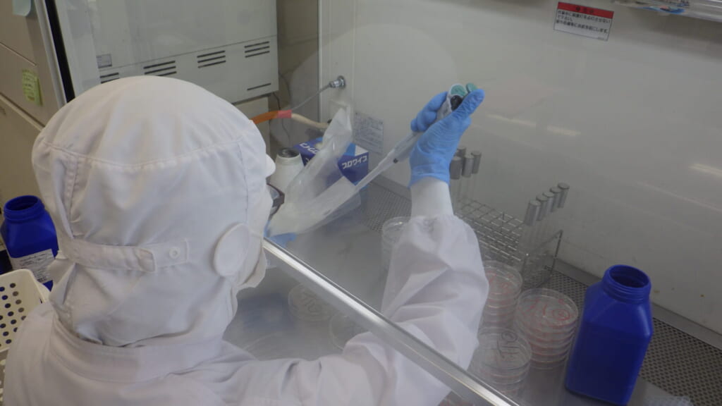 イートアンドの検査室では、有害な微生物が入らず、お客様に安心して食べていただけるように日々検査をしています。