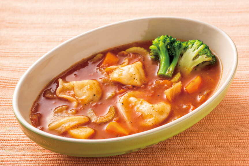 水餃子にトマトの旨味と酸味が染みわたるヘルシーなスープです。イタリアンテイストがボジョレーの軽やかさと好相性。