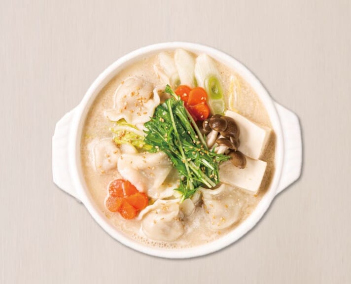 水餃子入りの豆乳鍋は、まろやかで優しい味わいが、ボジョレーの酸味と好バランス。