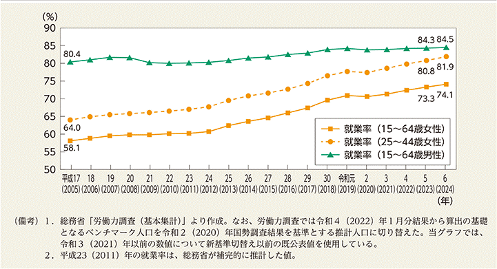 ところが、今や就業率は男性84.5%、女性74.1%(総務省・労働力調査、2024年:15~64歳)です。女性の就業率は上昇を続けてきて、男性との差はわずか10.4ポイントです。働き盛りの年代25~44歳の女性のみでは、就業率81.9%。男女の差はわずかになっています。