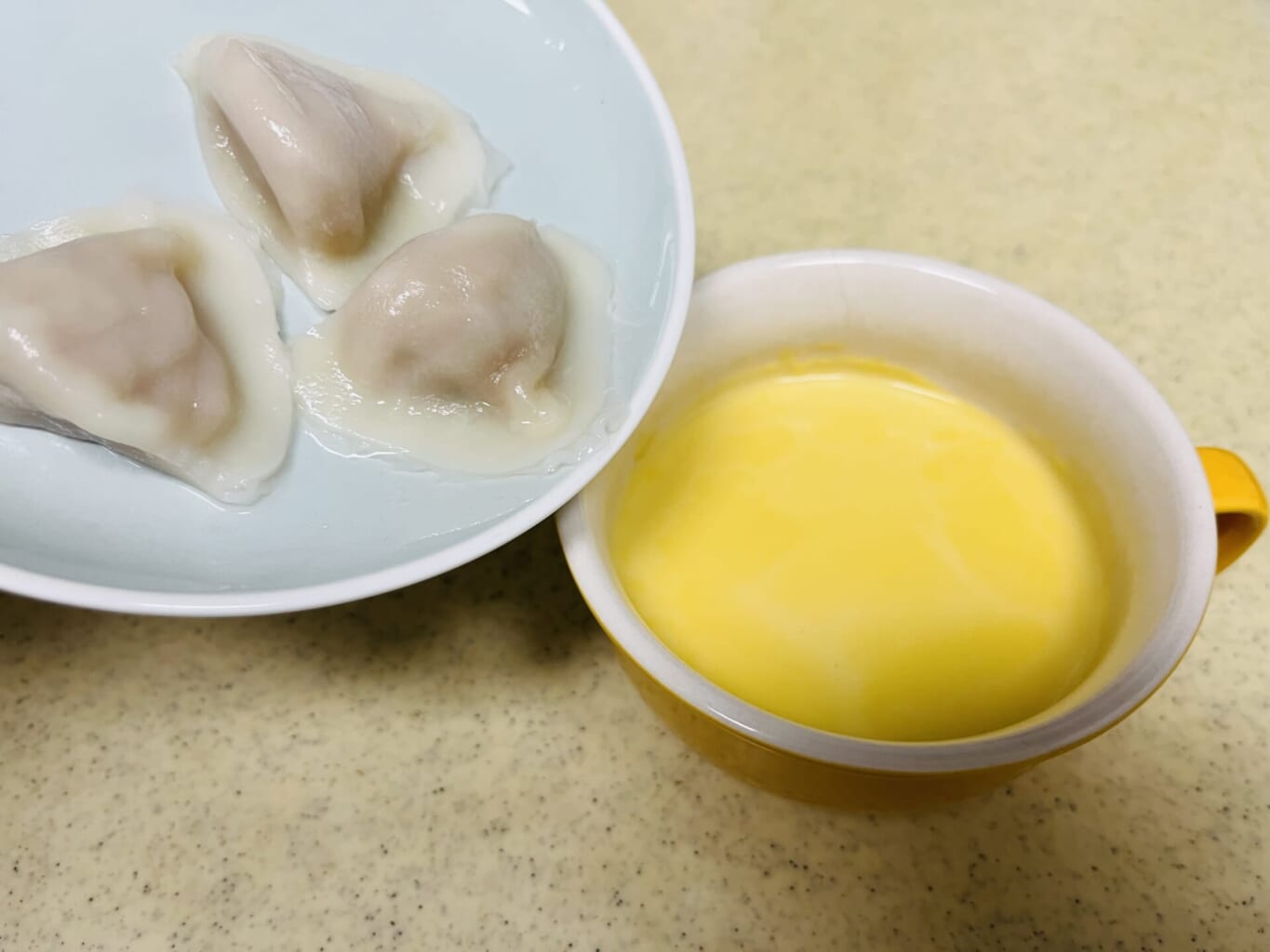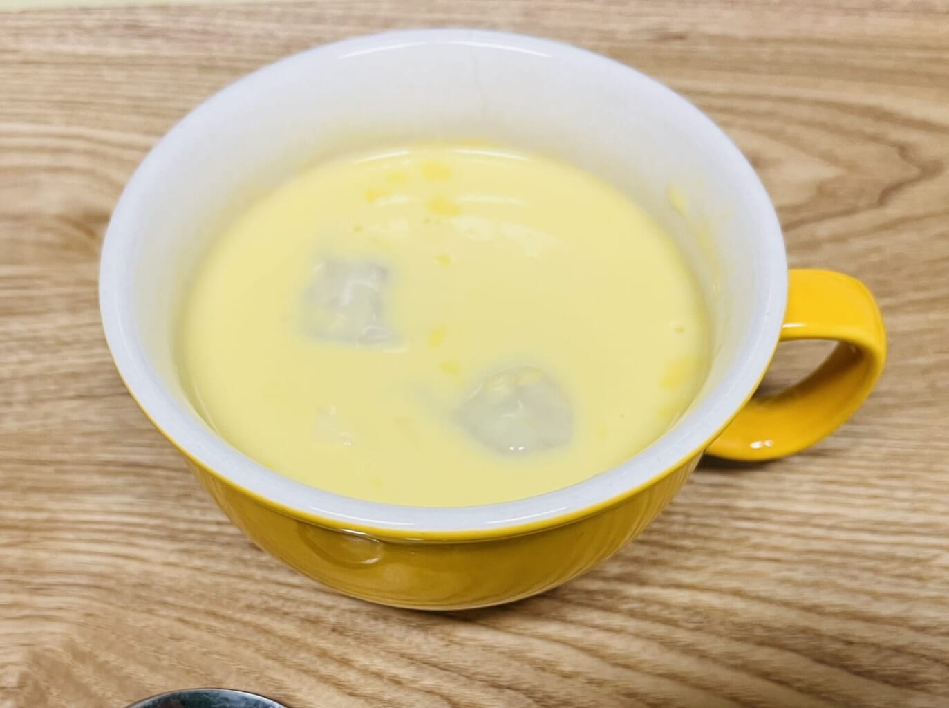 - レンジで温めたコーンスープにぷるもち水餃子を入れる