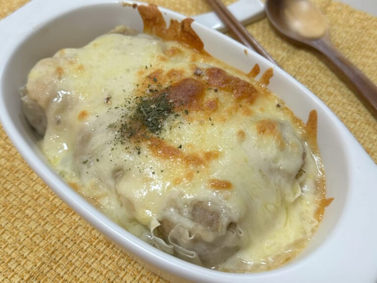 大阪王将 たれつき肉焼売を6個並べ、上からホワイトソース、チーズをかける