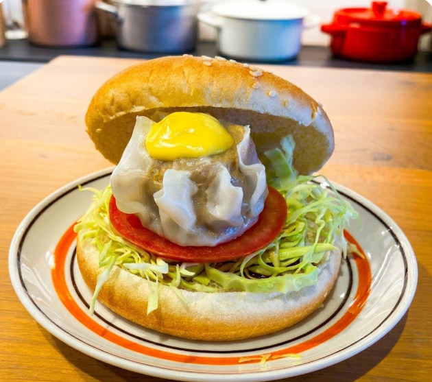 - 下側のバンズに千切りキャベツ、スライストマト、照り焼きソース、チーズしゅうまい、上側のバンズを重ねたら完成。