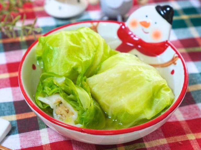 巻いて煮るだけの簡単調理!コンソメの旨味がキャベツとぷるもち水餃子の皮に染みて、クリスマスのごちそうにぴったりです。
