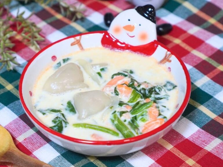 ぷるもち水餃子の鮭とほうれん草の牛乳スープ