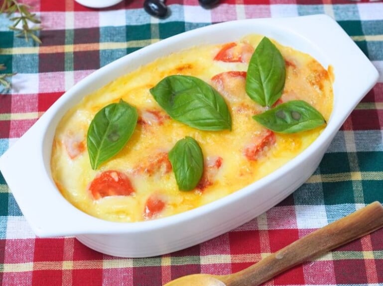 ホワイトソース→刻んだミニトマト→チーズの順にのせ、オーブントースターで7〜9分、チーズに焼き色が付くまで加熱します。